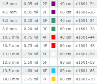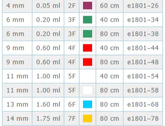 O cateter é codificado por cores de acorco com os diâmetros. Embalado em tubo plástico rígido, esterilizado em óxido de etileno.