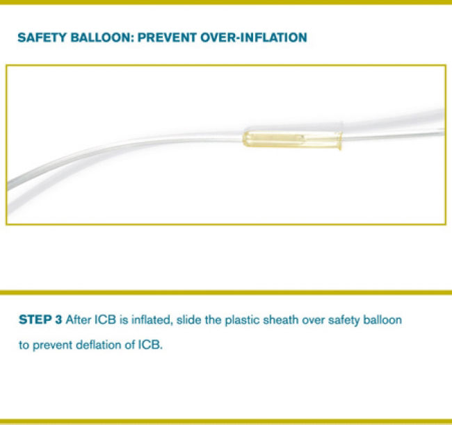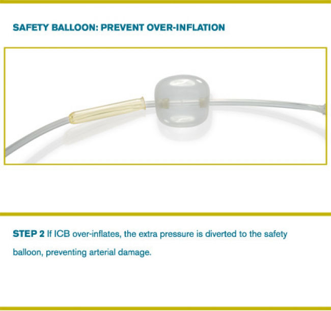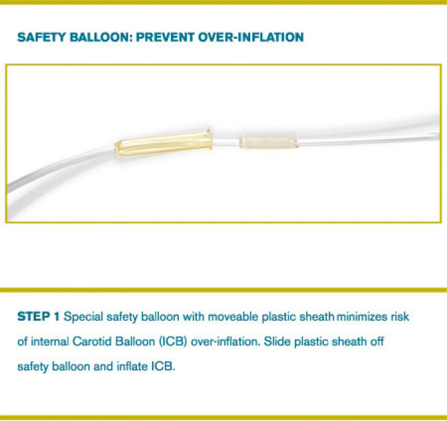 Com um balão de segurança externo incluso no braço do balão distal, inflavél somente quando ultrapassar a pressão máxima estabelecida de 15 psi, como alerta da possibilidade de danos ao vaso.